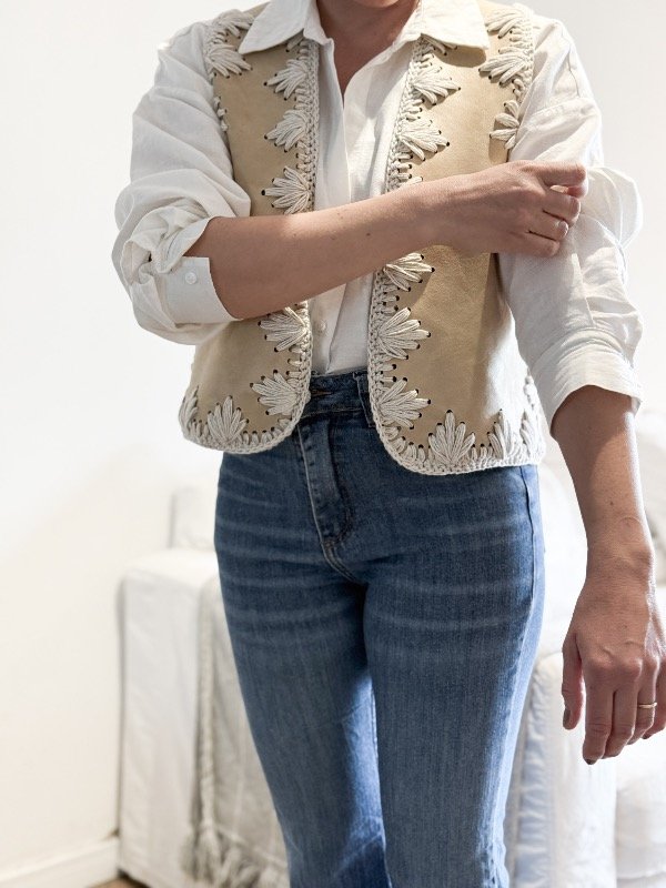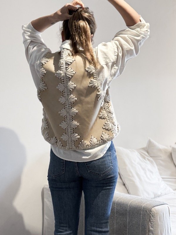 Chaleco de cuero con detalles tejidas en crochet con hilo de algodon.